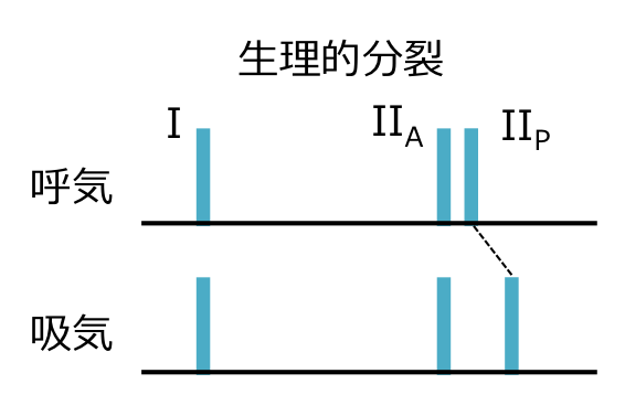 心音のII音は、心臓が拡張した時に大動脈弁と肺動脈弁が閉まる時の音。大動脈弁成分をIIA、肺動脈弁成分をIIPとすると、特定の条件下でIIAとIIPの2つの音がバラバラに聞こえることがある(分裂)。